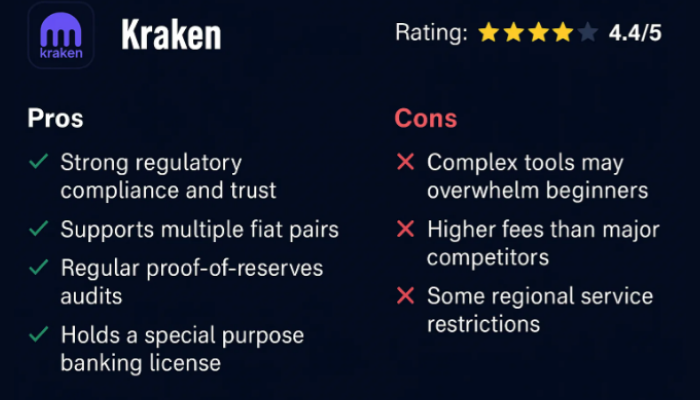 Kraken also provides convenient options like “Instant Buy” and stablecoin purchases, although these can come with higher fees of up to 1.5% plus conversion costs. The exchange is primarily focused on US users, so it’s particularly well-suited for American traders who want a regulated and reliable platform. Kraken even holds a special-purpose banking license, adding to its credibility.