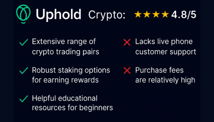 Uphold is a solid choice for both beginners and experienced traders who want a broad selection of cryptocurrencies, staking opportunities, and multiple wallet options, though users should be aware of its higher fees and limited customer support options.
