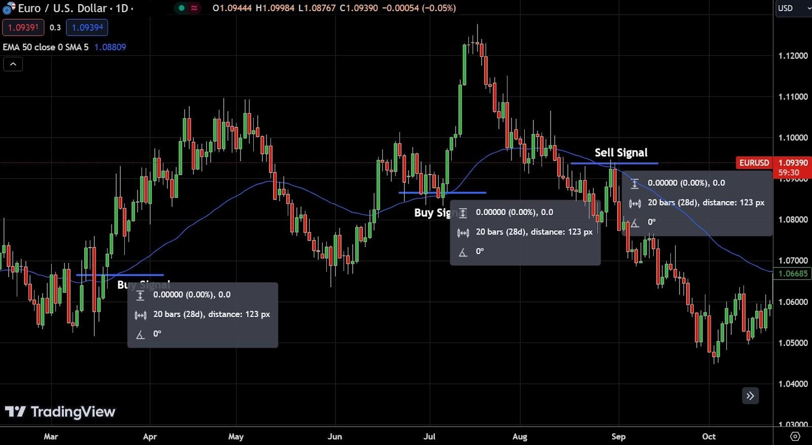 - A Buy Signal appears when price crosses above the EMA (for instance, near 1.08809), suggesting bullish momentum.