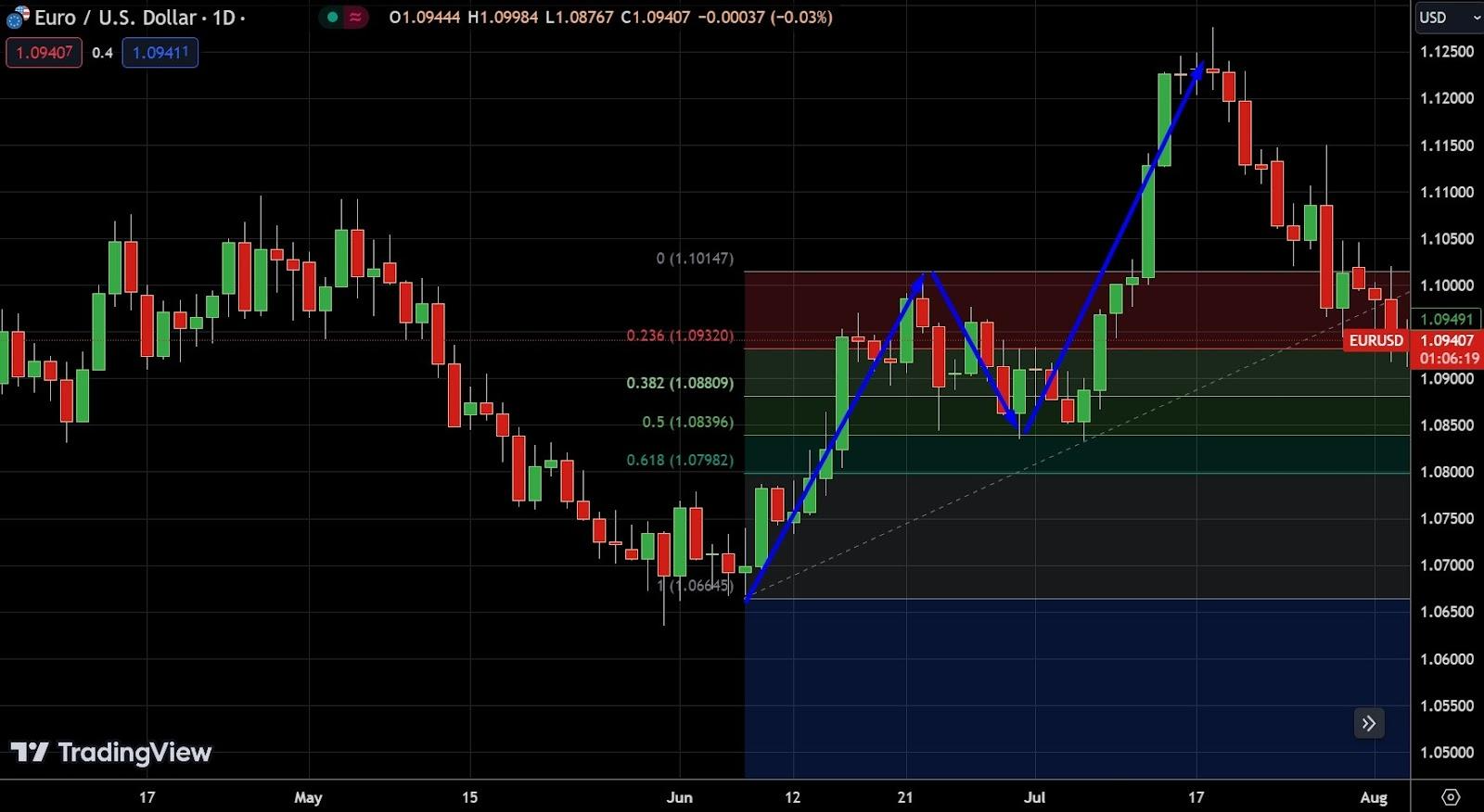On the EUR/USD daily chart, applying Fibonacci retracement provides a roadmap for understanding price movements and planning informed trading decisions. Here’s a simplified breakdown: