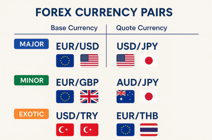 - Major pairs: Most traded, like EUR/USD or USD/JPY.