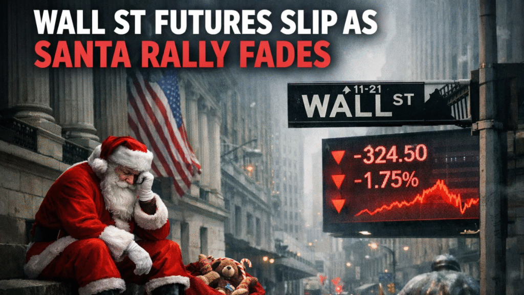 U.S. stock index futures edged lower late Tuesday as Wall Street headed into its final trading session of the year, weighed down by thin liquidity and fading seasonal optimism. S&P 500 futures slipped 0.2% to 6,933.75, Nasdaq 100 futures fell 0.2% to 25,621, and Dow Jones futures eased 0.1% to 48,617, reflecting a cautious tone ahead of the New Year holiday.