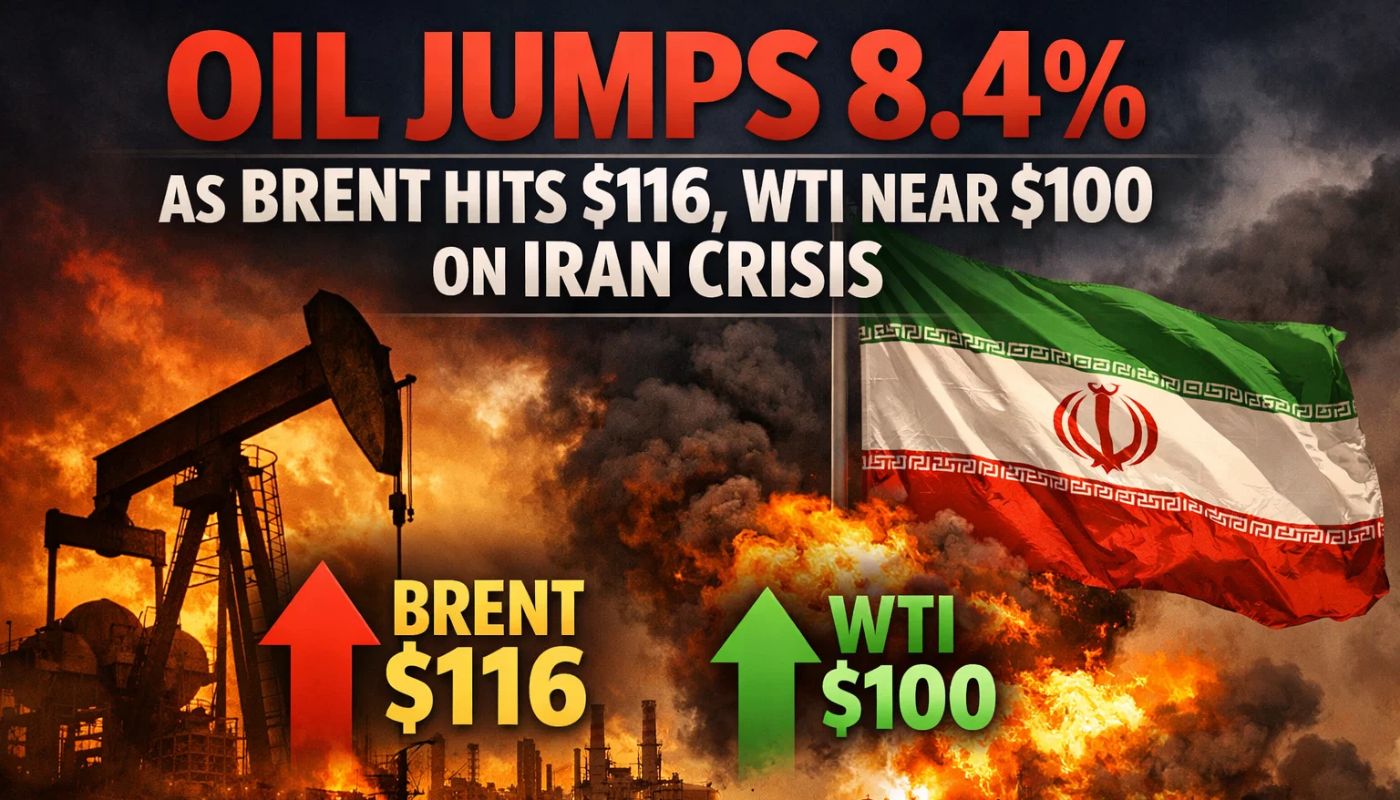 Oil prices surged sharply as tensions in the Middle East intensified, raising concerns about global supply disruptions. Brent crude futures climbed 8.4% to $116.35 per barrel, while U.S. West Texas Intermediate (WTI) rose 1.4% to $97.64, briefly touching $100.02 per barrel.